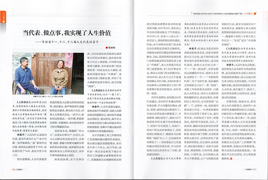 林善平:虹潤(rùn)公司是民營(yíng)的國(guó)家高新技術(shù)企業(yè)、國(guó)家專精特新小巨人企業(yè),處于國(guó)內(nèi)顯示控制儀表行業(yè)的領(lǐng)先地位。沒(méi)當(dāng)選代表前,我的人生目標(biāo)只有一個(gè)——“造一流儀表”,而自從跨進(jìn)議政履職平臺(tái)后,我的人生目標(biāo)又增加了一個(gè)——“當(dāng)稱職的代表”。為了當(dāng)好代表,我在履職之初就給自己劃了一條“底線”:本職工作和商務(wù)活動(dòng)再忙,只要是人大的會(huì)議、省市人大組織的集體履職活動(dòng),就必定參加。如果時(shí)間上有沖突,公司的事就“讓路”一下。記得有一次,我到福州參加省人代會(huì),一位客商在順昌的公司總部等了我好幾天,最后等不住,只好取消了合作。即便如此,我仍然不改初衷。而且,于我來(lái)說(shuō),履職對(duì)我更好地經(jīng)營(yíng)管理企業(yè)有很大的幫助。擔(dān)任代表職務(wù),使我開闊了視野,對(duì)黨和國(guó)家的大政方針政策、法律法規(guī)有了更多更好的領(lǐng)會(huì),民主意識(shí)、法治意識(shí)、誠(chéng)信意識(shí)更強(qiáng)了,有助于辦好企業(yè)、規(guī)范管理、開拓市場(chǎng)、規(guī)避風(fēng)險(xiǎn)。10多年來(lái),公司的核心競(jìng)爭(zhēng)力不斷增強(qiáng),生產(chǎn)與銷售持續(xù)領(lǐng)跑全行業(yè),被評(píng)為國(guó)家知識(shí)產(chǎn)權(quán)優(yōu)勢(shì)企業(yè)、福建省七家入選國(guó)家智能制造標(biāo)準(zhǔn)應(yīng)用試點(diǎn)企業(yè)之一、福建省十家院士專家示范工作站之一,“虹潤(rùn)”成為“中國(guó)馳名商標(biāo)”。