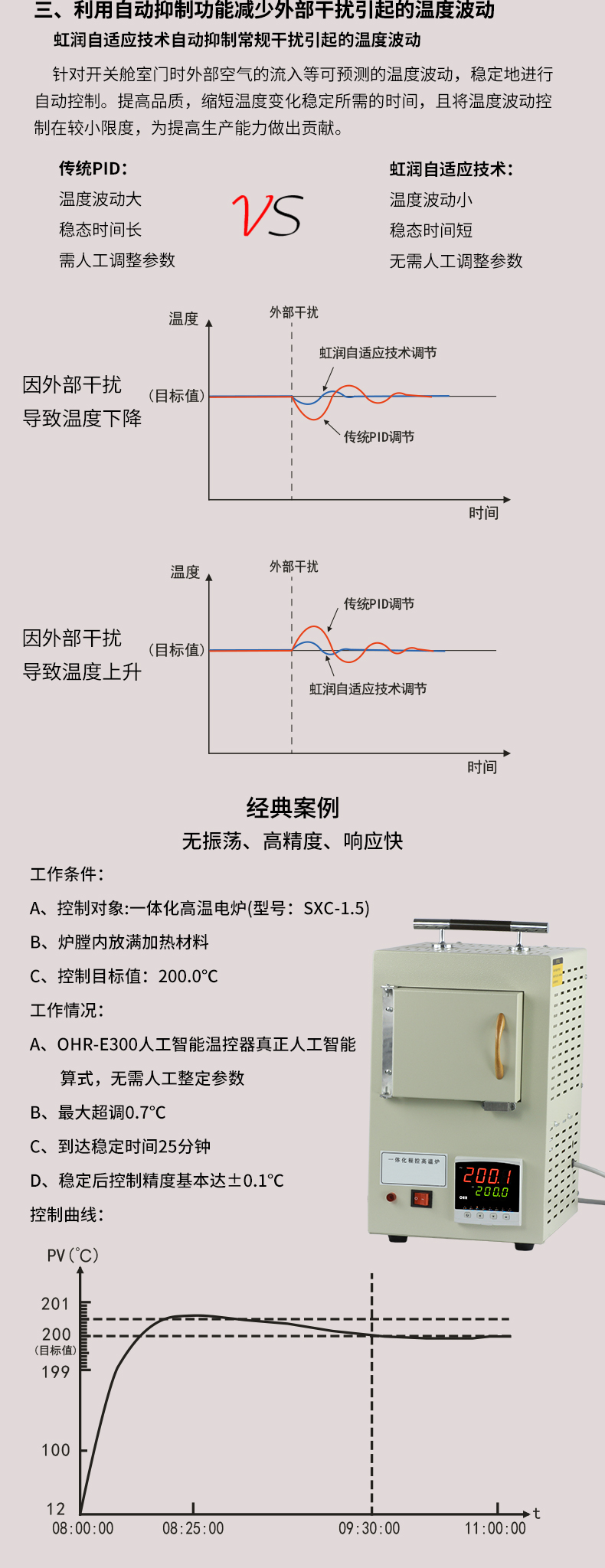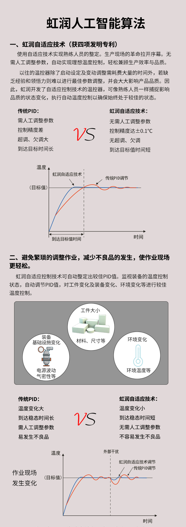 虹潤公司是專業(yè)生產(chǎn)溫控器的國家專精特新“小巨人”企業(yè)。生產(chǎn)的人工智能溫控器,具有真正人工智能算式,無需人工整定參數(shù),控制精度可達(dá)±0.1°C,多種輸出類型,高抗干擾等特點(diǎn)。產(chǎn)品獲得模糊PID控制儀及控制方法、人工智能調(diào)節(jié)器、智能化控制器、移相觸發(fā)控制器、閥門自動(dòng)手動(dòng)無擾動(dòng)操作控制方法及裝置等5項(xiàng)國家發(fā)明專利,主持起草物聯(lián)網(wǎng)智能溫度儀表通用技術(shù)條件、工業(yè)過程控制系統(tǒng)用模擬輸入兩位或多位輸出儀表、工業(yè)過程測量和控制系統(tǒng)用智能調(diào)節(jié)器等3項(xiàng)國家標(biāo)準(zhǔn),參與國際5G標(biāo)準(zhǔn)制定,取得模糊PID溫控儀等3項(xiàng)相關(guān)軟件著作權(quán)。產(chǎn)品廣泛應(yīng)用于電力、石化,冶金、制藥、食品等幾乎所有工業(yè)現(xiàn)場,實(shí)現(xiàn)精準(zhǔn)控溫,保障生產(chǎn)安全與質(zhì)量。
