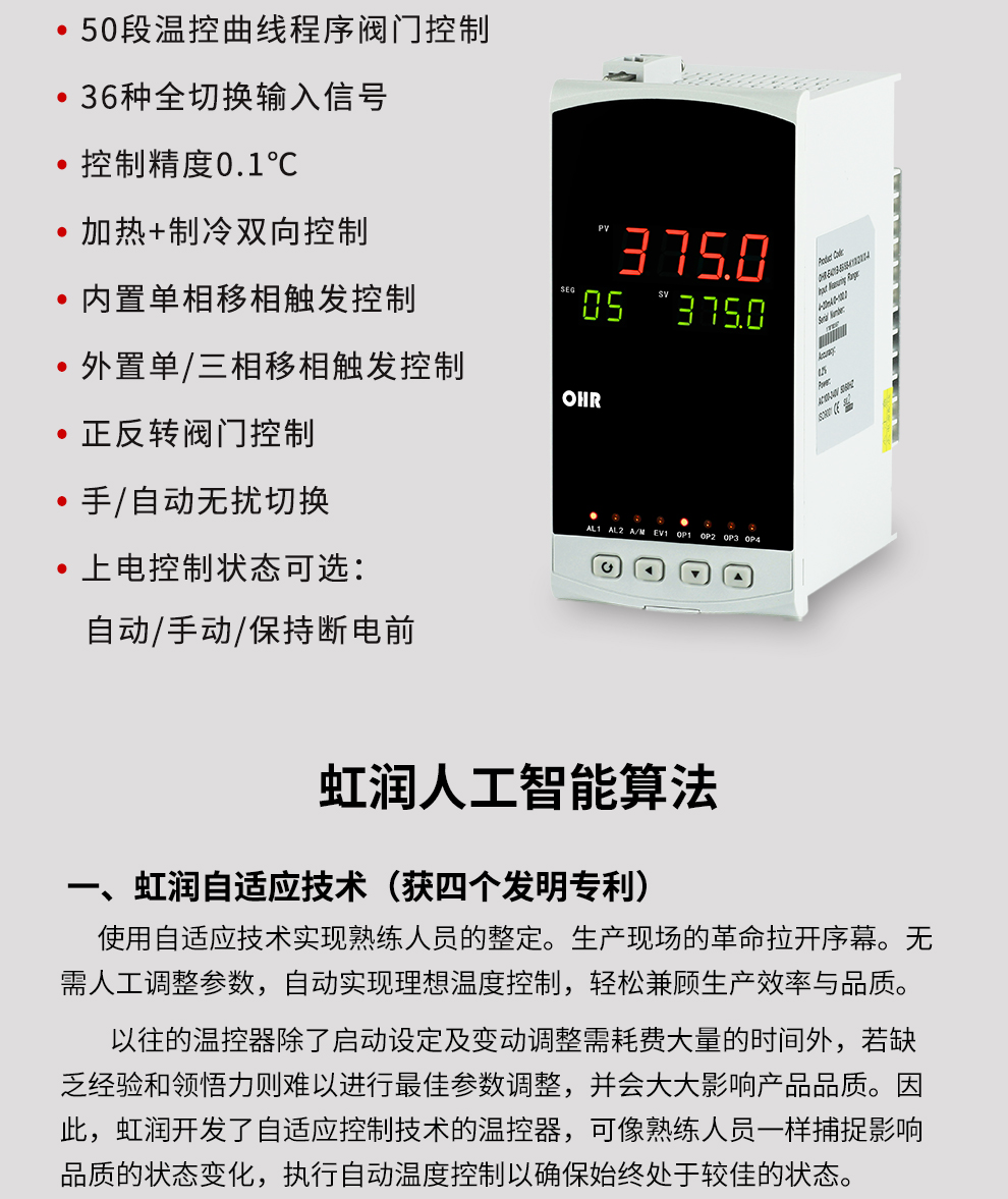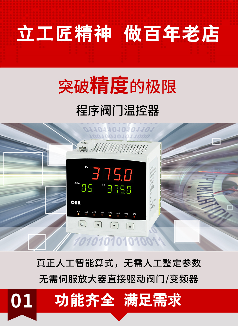 OHR-E401系列程序閥門溫控器/調(diào)節(jié)儀采用真正的人工智能算式,儀表啟動(dòng)自整定功能,可以根據(jù)被控對(duì)象的特性,自動(dòng)尋找最優(yōu)參數(shù)以達(dá)到很好的控制效果,無需人工整定參數(shù)??販鼐然具_(dá)±0.1℃,無超調(diào)、欠調(diào),達(dá)國(guó)際先進(jìn)水平。