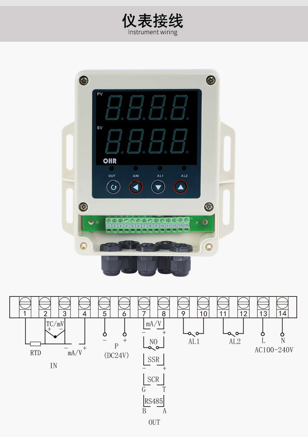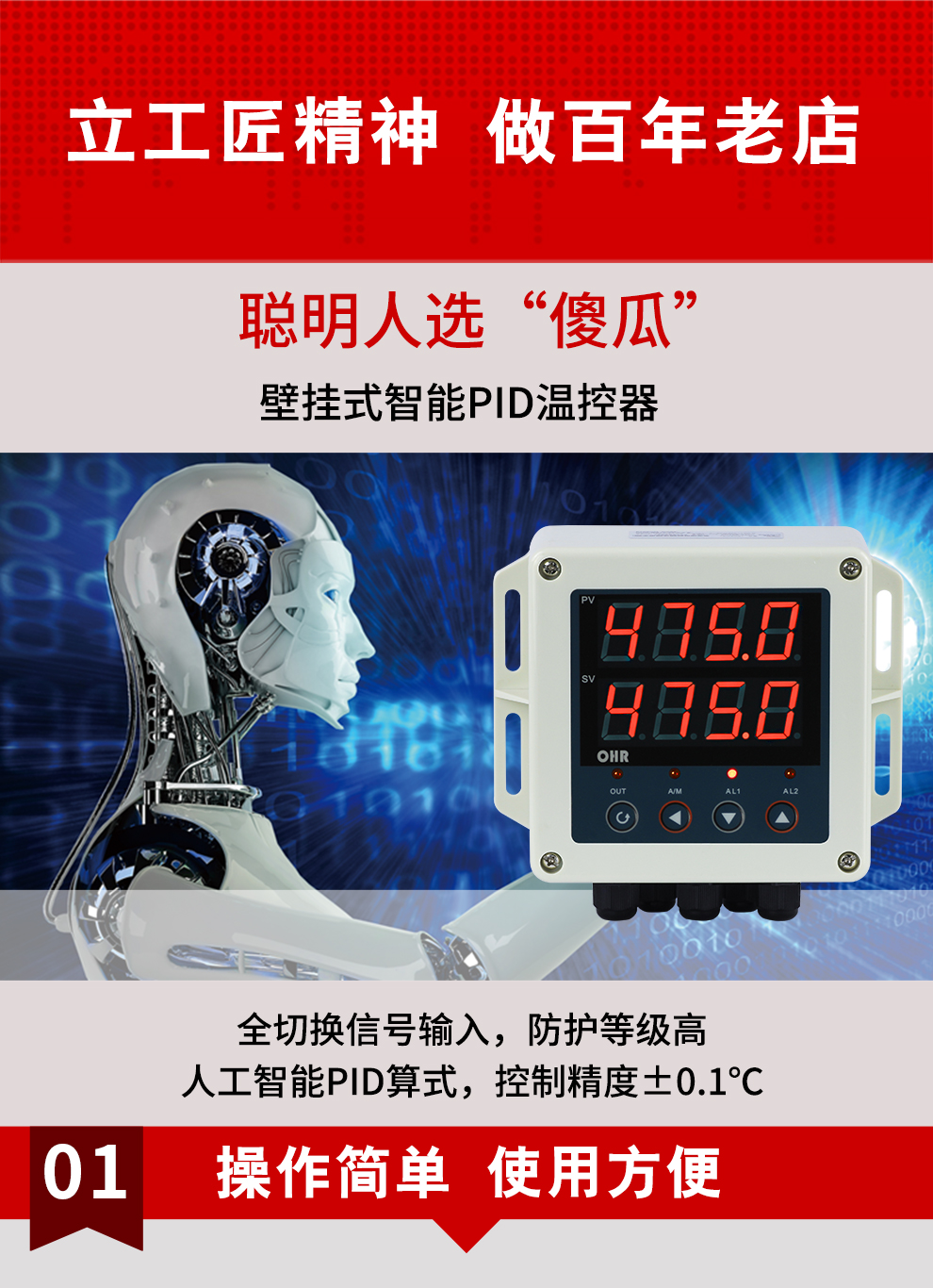 OHR-BG30/BG40系列壁掛式智能溫控器/60段程序溫控器采用了表面貼裝工藝,全自動貼片機生產,具有很強的抗干擾能力。本儀表采用人工智能算式,儀表啟動自整定功能,可以根據被控對象的特性,自動尋找參數以達到很好的控制效果,無需人工整定參數,控溫精度基本達±0.2℃,無超調、欠調,性價比高。