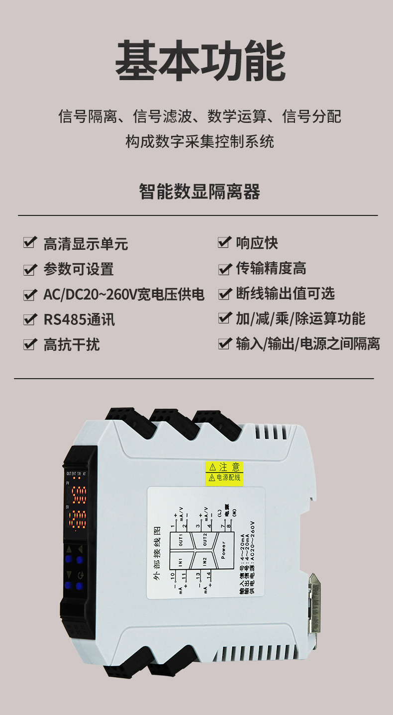 虹潤(rùn)公司是專業(yè)生產(chǎn)隔離器的國(guó)家專精特新“小巨人”企業(yè)。生產(chǎn)的智能數(shù)顯隔離器 ,具有高清顯示單元,參數(shù)可設(shè)置,寬電源供電,響應(yīng)快,帶RS485通訊等特點(diǎn)。產(chǎn)品獲得信號(hào)隔離器、一種二端子模塊、無源信號(hào)隔離器等3項(xiàng)國(guó)家發(fā)明專利,主持起草現(xiàn)場(chǎng)設(shè)備工具(FDT)接口規(guī)范、工業(yè)過程測(cè)量和控制系統(tǒng)用隔離式安全柵、工業(yè)過程測(cè)量和控制系統(tǒng)用配電器等3項(xiàng)國(guó)家標(biāo)準(zhǔn),參與國(guó)際5G標(biāo)準(zhǔn)制定,取得智能隔離器等2項(xiàng)相關(guān)軟件著作權(quán)。產(chǎn)品廣泛應(yīng)用于電力、石化,冶金、制藥、水處理、機(jī)械配套等各種工業(yè)現(xiàn)場(chǎng)。