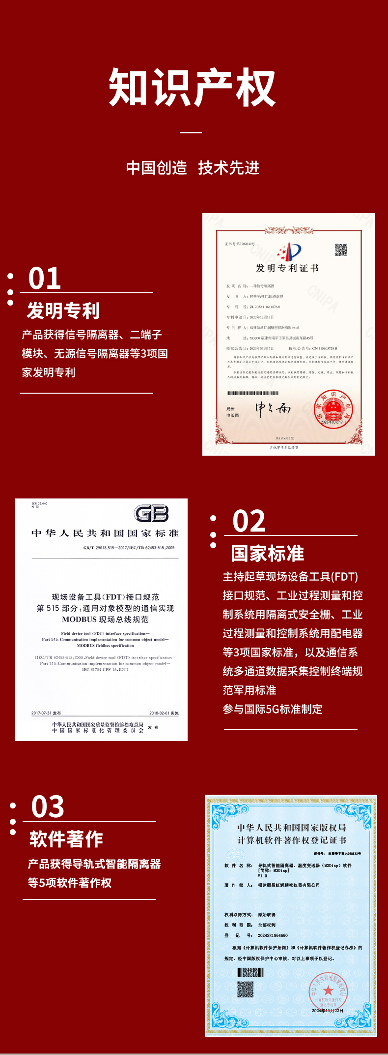 虹潤公司是專業(yè)生產(chǎn)隔離器的國家專精特新“小巨人”企業(yè)。生產(chǎn)的智能信號隔離器涵蓋電流電壓變送器、溫度變送器、配電器、頻率轉(zhuǎn)換器、開關量轉(zhuǎn)換器及通訊轉(zhuǎn)換器等多種產(chǎn)品類型。產(chǎn)品獲得信號隔離器、一種二端子模塊、無源信號隔離器等3項國家發(fā)明專利,主持起草現(xiàn)場設備工具(FDT)接口規(guī)范,工業(yè)過程測量和控制系統(tǒng)用配電器、工業(yè)過程測量和控制系統(tǒng)用隔離式安全柵等3項國家標準,參與國際5G標準制定,取得導軌式智能隔離器、頻率轉(zhuǎn)換器等3項相關軟件著作權。產(chǎn)品廣泛電力、冶金、工業(yè)電爐、變電站、高壓電機房等需要電隔離的工業(yè)自動化控制系統(tǒng)。