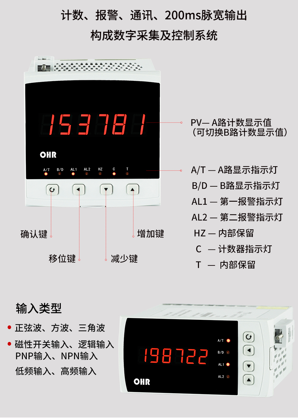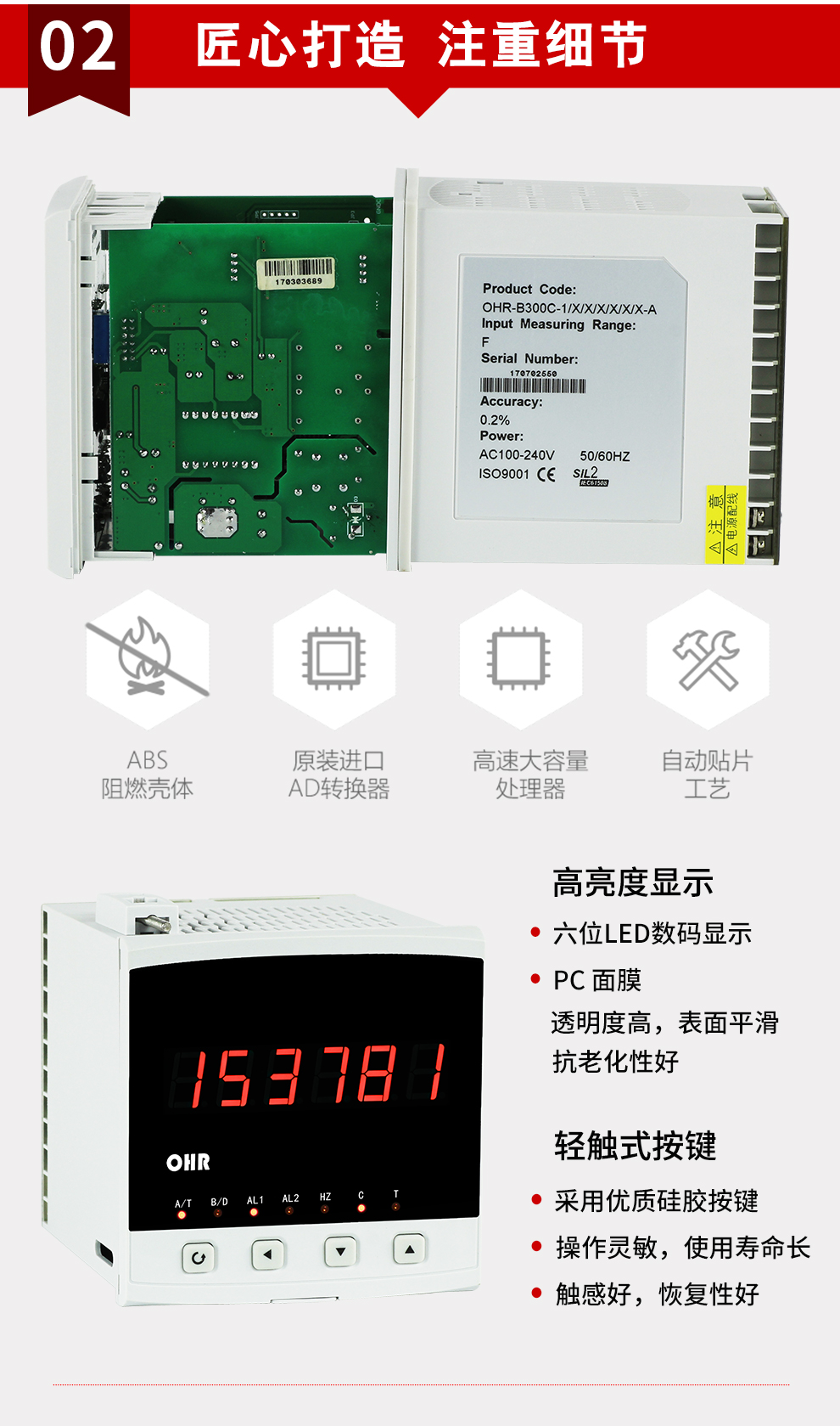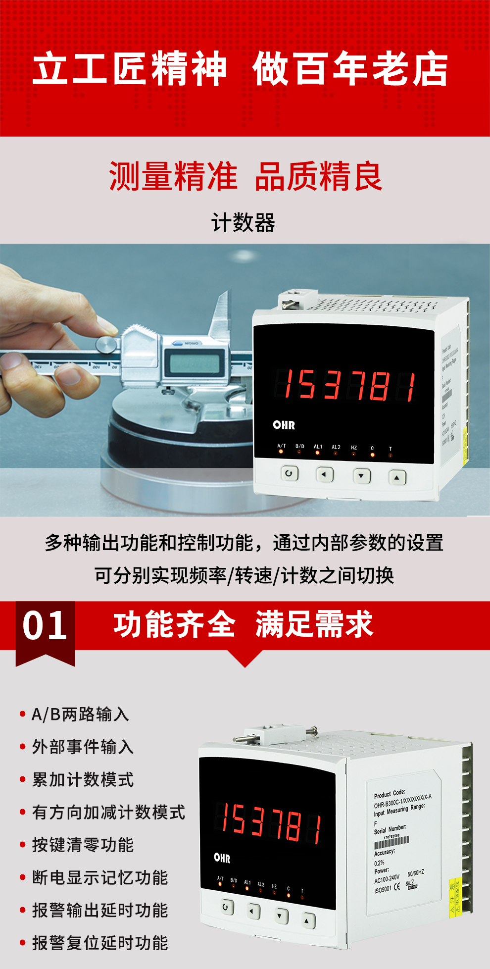 OHR-B300系列計數(shù)器采用全自動貼片封裝工藝,具有很強(qiáng)的抗干擾能力,并具有多種輸出功能和控制功能,多種計數(shù)模式,廣泛運用于電力、石化、冶金、輕工、制藥、航空等諸多領(lǐng)域。