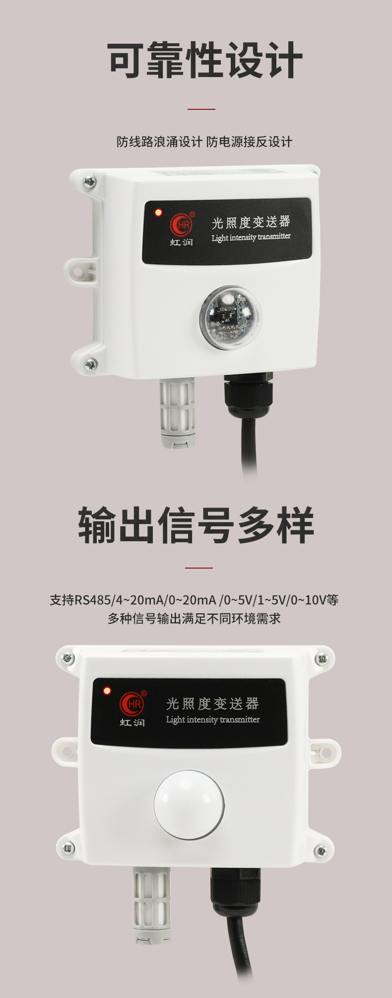 虹潤公司是專業生產環境監測儀表的國家專精特新“小巨人”企業。生產的光照變送器,具有高精度感光傳感器,響應靈敏,準確度高,低功耗,模擬量變送輸出或RS485通訊等特點。產品獲得一種農業監控變送器、一種儀表電源等2項實用新型專利,主持起草現場設備工具(FDT)接口規范、物聯網總體技術智能傳感器特性與分類等2項國家標準,參與國際5G標準制定,取得農業監測變送器等3項相關軟件著作權。產品廣泛應用于溫室大棚、花卉養殖、科研實驗、智能樓宇、戶外照明等環境場合對光照度的檢測。