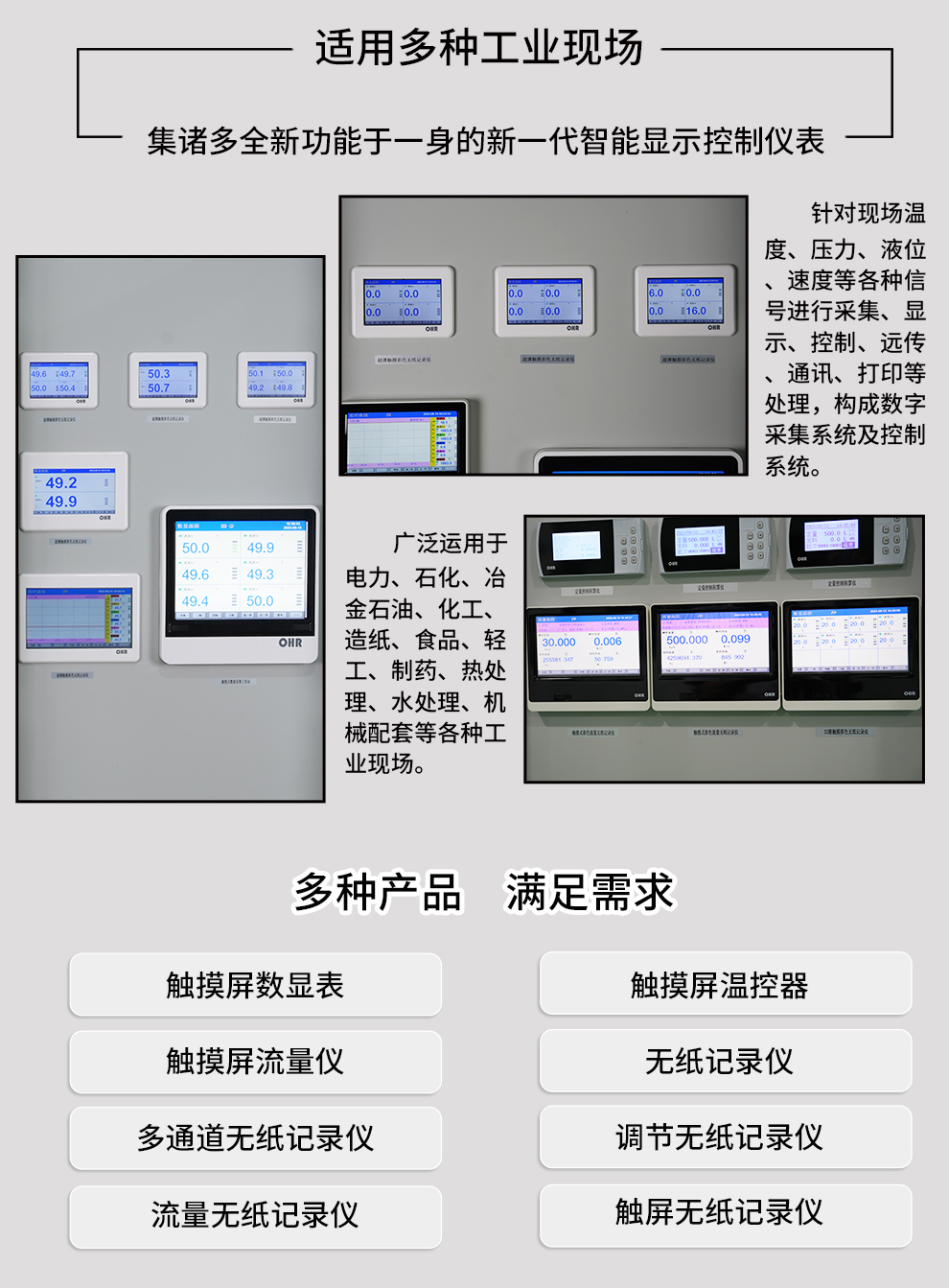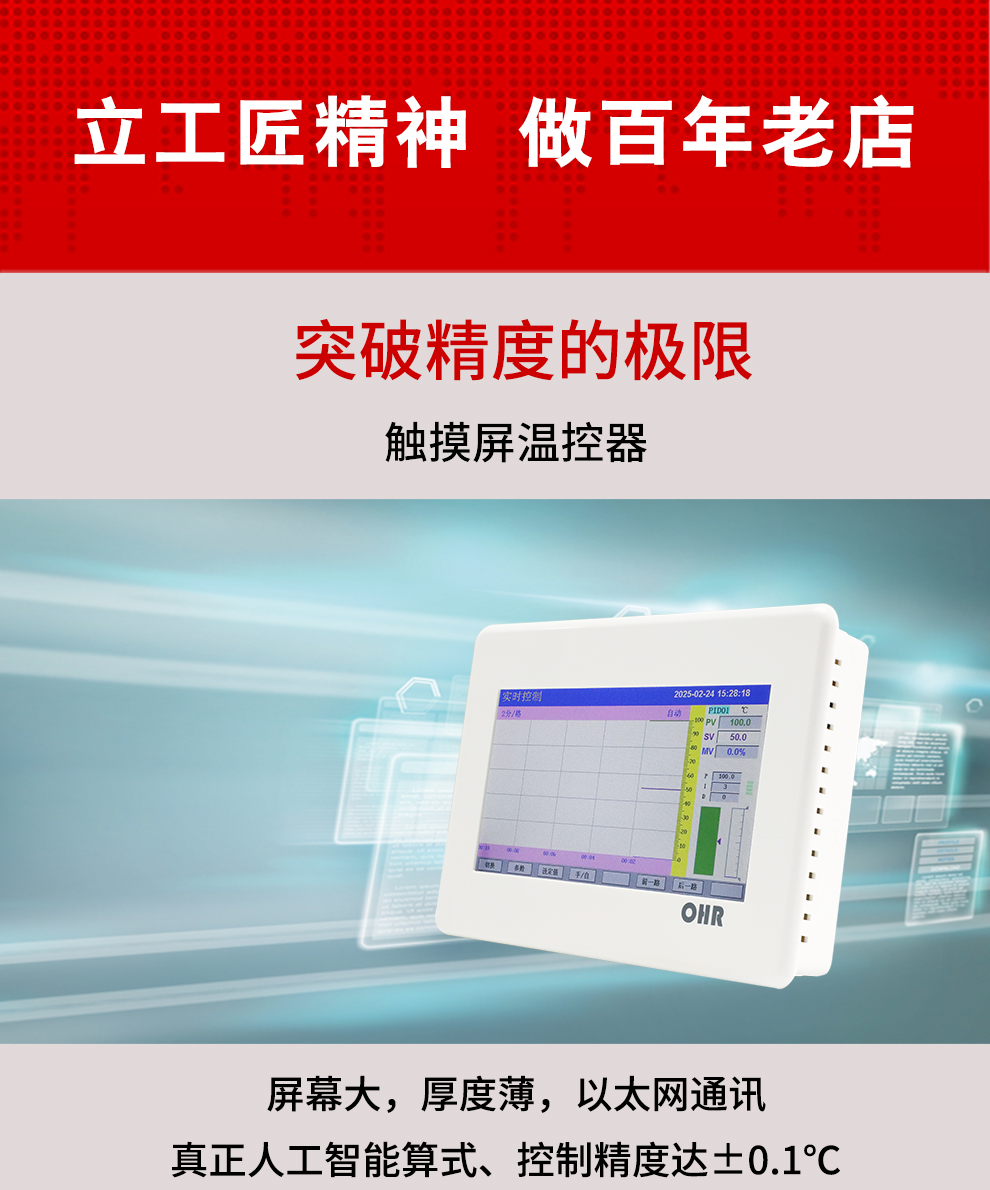 OHR系列觸摸屏溫控器采用真正的人工智能算式,儀表啟動自整定功能,可以根據被控對象的特性,自動尋找最優參數以達到很好的控制效果,無需人工整定參數。控溫精度基本達±0.1℃,無超調、欠調,達國際先進水平。4路萬能信號輸入,可帶2路PID 控制,RS485通訊接口,以太網接口。