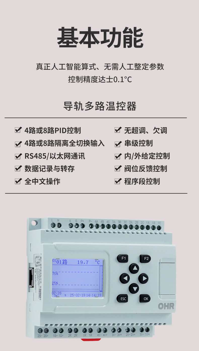 虹潤公司是專業生產溫控器的國家專精特新“小巨人”企業。生產的導軌多路溫控器,具有4路或8路PID控制,真正人工智能算式,無需人工整定參數,控制精度達士0.1°C,數據記錄與轉存等特點。產品獲得智能化控制器、人工智能調節器及調節方法、模糊PID控制儀及控制方法、一種平板無紙記錄儀、巡回檢測顯示方法及裝置等5項國家發明專利,主持起草物聯網智能記錄儀表、物聯網智能溫度儀表、工業過程測量和控制系統用智能調節器等3項國家標準,參與國際5G標準制定,取得液晶溫控器儀表等3項相關軟件著作權。產品廣泛應用于電石化、工業爐、試驗設備、注塑機械、包裝機械等需要對現場溫度進行監測控制的行業。